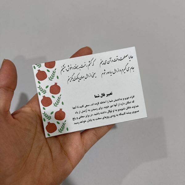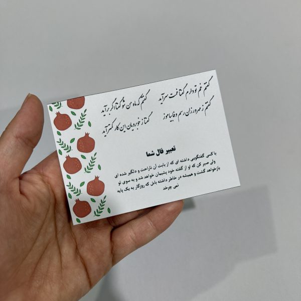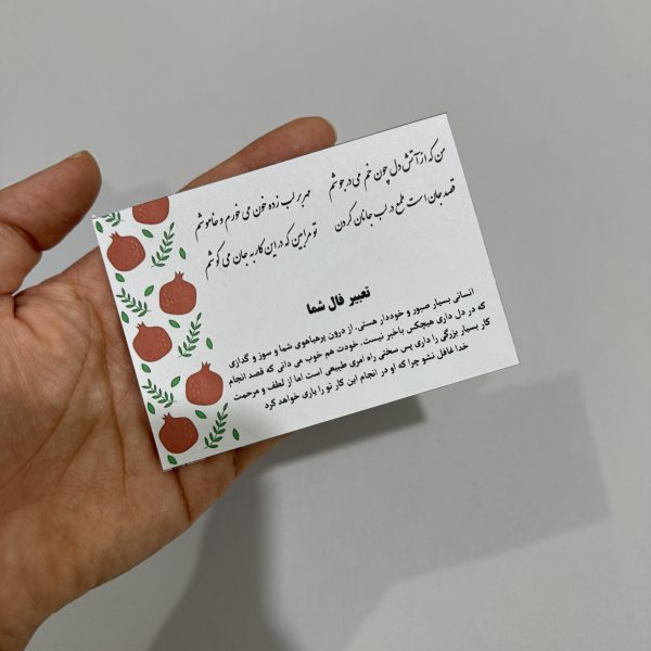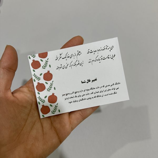 ✅این گیفت با ۸عدد فال مختلف طراحی شده و به صورت رندوم و از همه فال ها برای شما ارسال میشه در ضمن ما هیچ گونه کارتی بصورت آماده نداریم و بعد از ثبت سفارش شما شروع به چاپ و برش میکنیم پس حتما حداقل 5 روز رو برای انجام کارها و آماده سازی گیفت درنظر داشته باشید (ارسال سفارش این محصول حداقل 5 روز بعداز ثبت سفارش)
