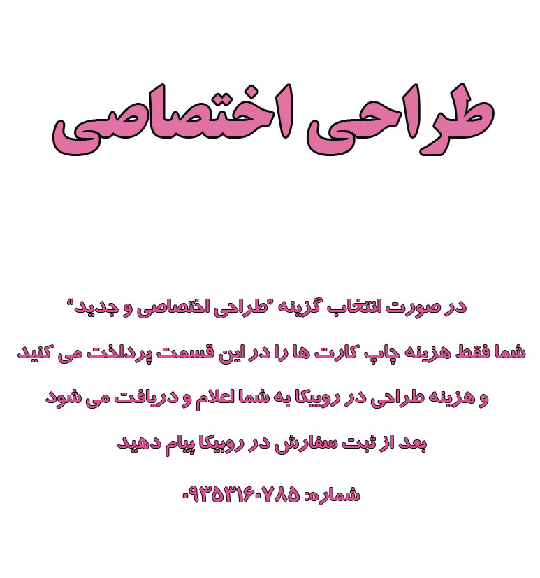 بعد از ثبت سفارش، اسم و عکس فرزندتون رو در روبیکا ارسال کنید. ابعاد کارت ها 10 در 10 سانتی متر است. / ✅ در صورت انتخاب گزینه "طراحی اختصاصی و جدید" شما فقط هزینه چاپ کارت ها را در این قسمت پرداخت می کنید و هزینه طراحی در روبیکا به شما اعلام و دریافت می شود. بعد از ثبت سفارش در روبیکا پیام دهید. /🚚 در صورتی که برای دریافت سفارش خود عجله دارید، در مرحله آخر ثبت سفارش نحوه دریافت را گزینه "ارسال فوری" انتخاب کنید/ هزینه طراحی بین 100 الی 200 هزار تومان می باشد. شماره: 09353160785