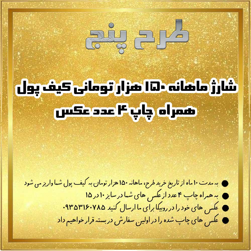 | طرح 5 | شارژ ماهانه 150 هزار تومانی کیف پول + چاپ ۴ عدد عکس 💵 |