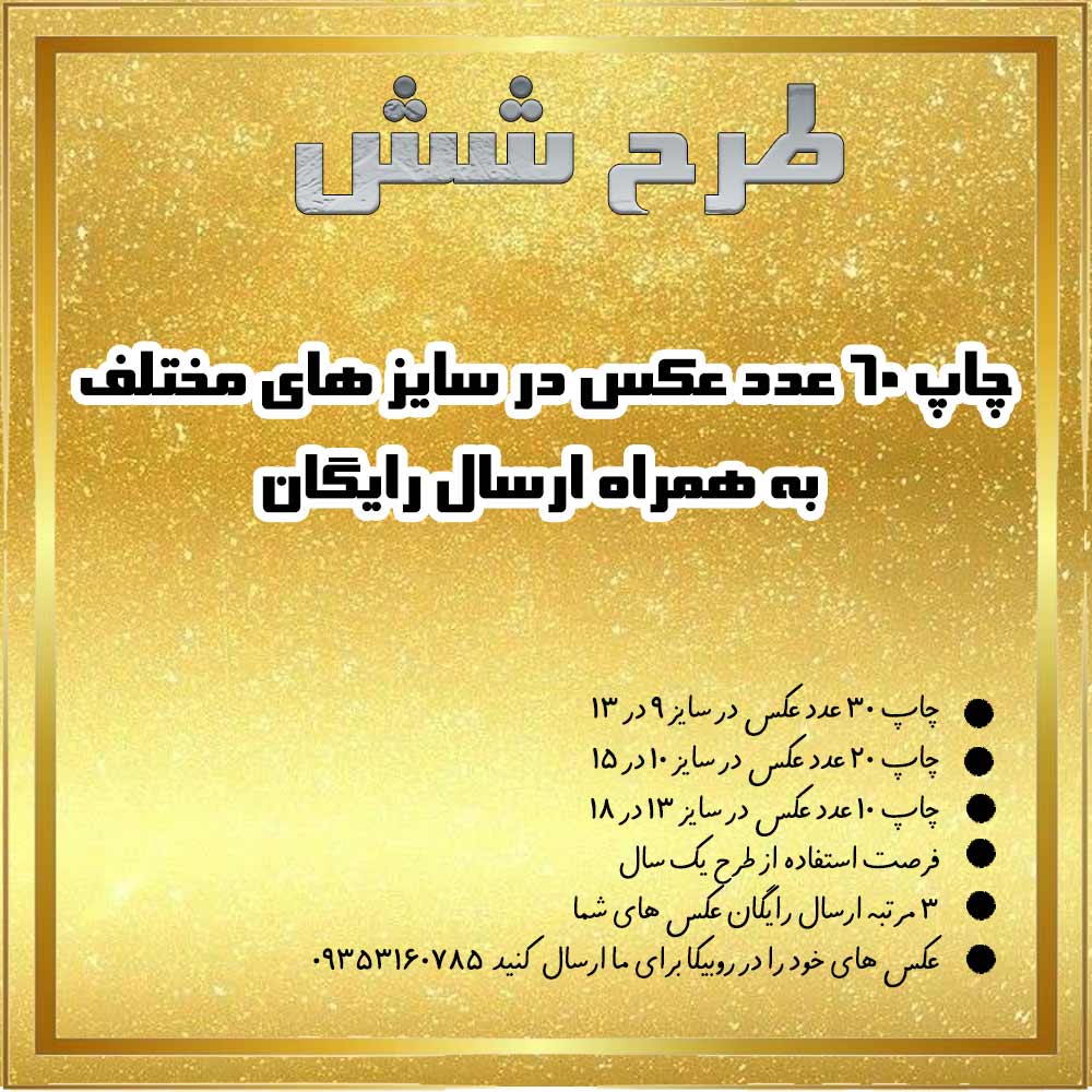 | طرح 6 | چاپ 60 عدد عکس در سایز های مختلف به همراه ارسال رایگان 😍 |